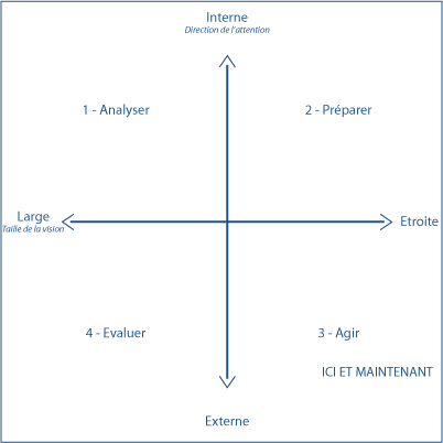 On peut ensuite se concentrer de manière Large et Externe c’est à dire sur l’environnement de l’action et comment je me situe par rapport à cet environnement afin d’y mener une évaluation de la situation, et de son propre apport sur la situation.
